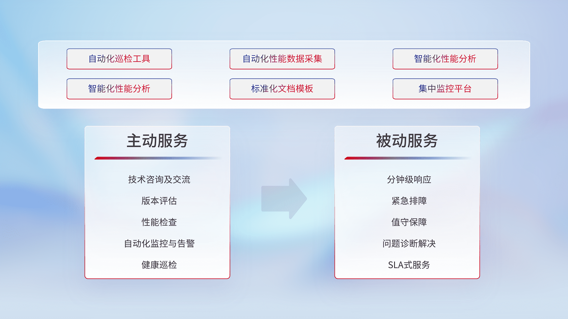 智能化工具和标准化文档,,保障服务质量,,,提供主动服务(包含技术咨询、、、版本评估、、、、性能检查、、、自动化监控与告警、、健康巡检)和被动服务包含(分钟级响应、、紧急排障、、、值守保障、、问题诊断解决、、、SLA服务)。。。。